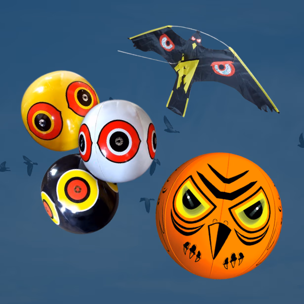 Reconnaissables à leurs yeux holographiques surdimensionnés et leurs couleurs vives, les ballons Terror Eyes et Scare Eye reproduisent l'apparence menaçante des prédateurs naturels. Leur structure gonflable en vinyle renforcé résiste parfaitement aux intempéries tout en conservant une mobilité optimale sous l'action du vent.