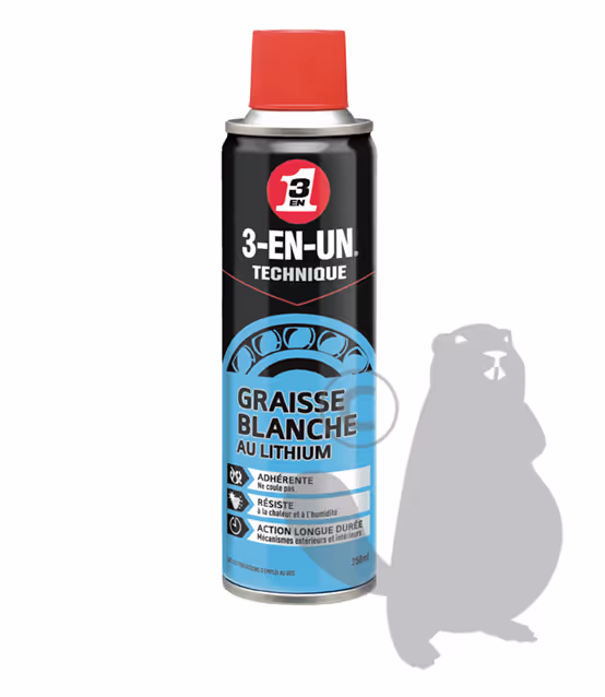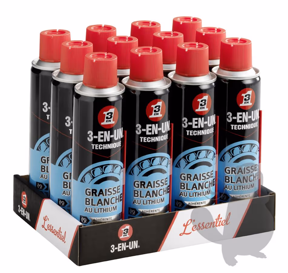 Graisse blanche au lithium 3EN1 adhérente longue durée - Ne coule pas - AÉROSOL de 250 mlGraisse adhérente longue durée. Empêche la rouille et la corrosion. Résiste aux hautes températures et à l'humidité. Ne coule pas. Utilisation par température de -10 °C à +250 °C.