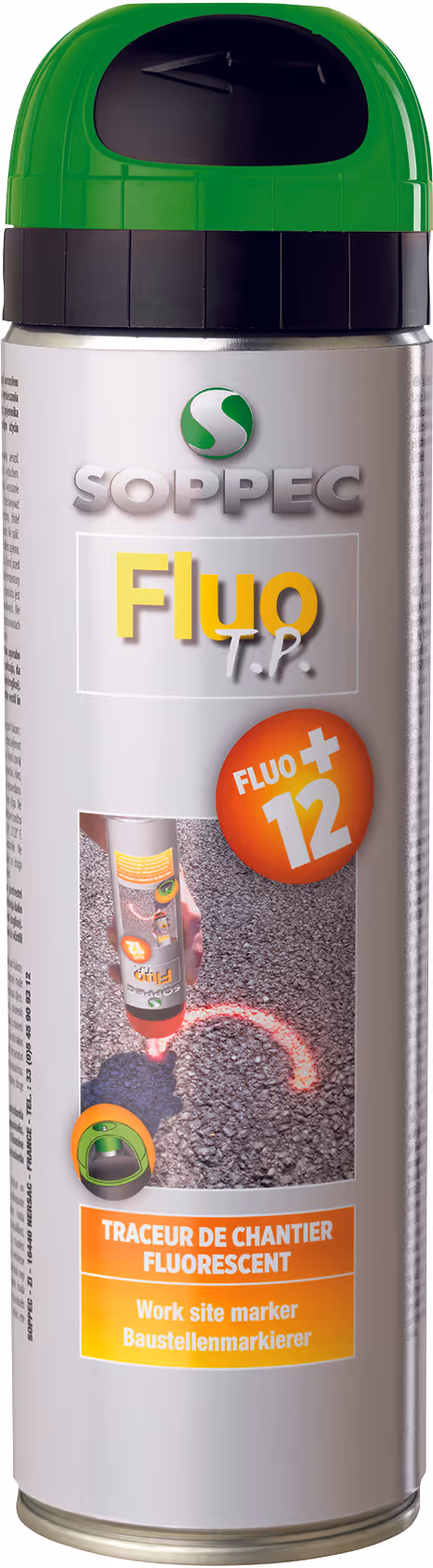 FLUO TP® est conçu pour répondre aux exigences les plus élevées de visibilité et de durée de marquage. Il est particulièrement apprécié dans lunivers de la topographie pour les repérages et piquetage, mais sutilise aussi pour les divers travaux de marquages en voiries, terrassement, canalisations, constructions.Grâce à sa nouvelle formulation (2016) encore plus chargée en pigments fluorescent, le FLUO TP® est le traceur de chantier le plus visible et le plus fluorescent du marché.Dutilisation facile et sûre, le FLUO TP® est doté du capot de sécurité « TP » breveté SOPPEC.Utilisable sur divers supports: bétons, bitumes, herbe, graviers, sables, minéraux, bois. Capot de sécurité très résistant (pas de rupture à la chutede 1.50m dun aérosol plein).