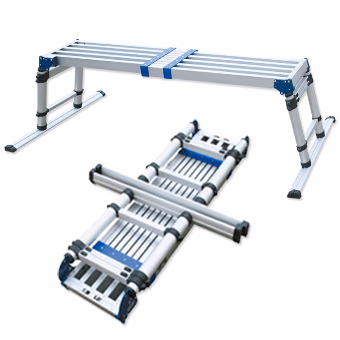 SUPER LÉGÈRE / PLIANTE / MONTAGE FACILE Largueur: 300mm Longueur plate-forme fermé: 1.090mm Longueur plate-forme étendue: 1.750mm Hauteur régable de la plate-forme: 520-900mm Largueur des marches: 40mm Distance entre les échelons: 250mm Positions: 42 (14 en horizontales x 3 en verticale) Hauteur 1: 520mm Hauteur 2: 700mm Hauteur 3: 900mm RENCONTRE AVEC: EN 131