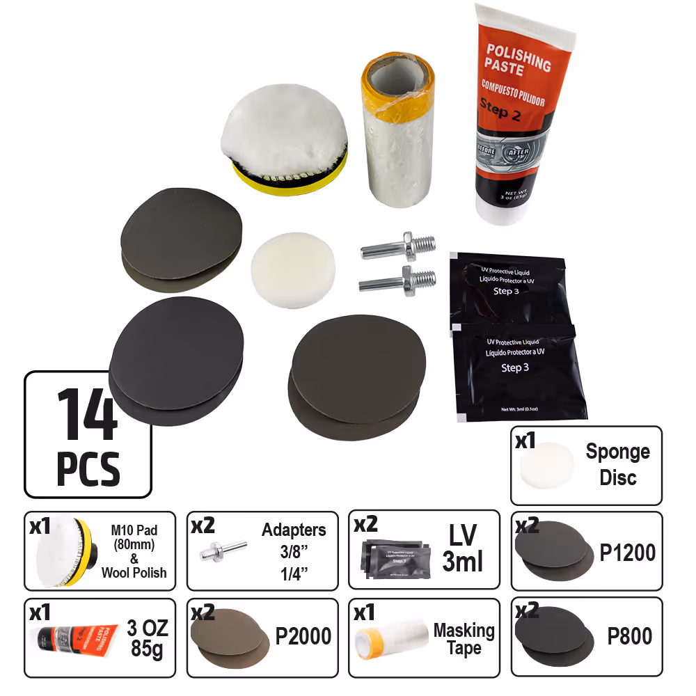 Le kit est conçu pour restaurer la transparence de verres optiques jaunis ou atténués des phares. Le kit de restauration de verres des phares augmente leur efficacité. Trois simples étapes: meulage, polissage et protection. Restaure les feux avant, arrière, antibrouillard ou les indicateurs de direction. Ce kit est conçu pour restaurer 2 phares. COMPLÉTUDE: 2x roues démeri P800. 2x roues démeri P1200. 2x roues démeri P2000. 1x 85 g de pâte à polir. 2x 3,0 ml de liquide de protection UV. 1x ruban adhésif. 1x roue à polir en laine. 1x disque éponge blanc. 1x buse, filetage M10. 2x adaptateur (3/8 et 1/4)