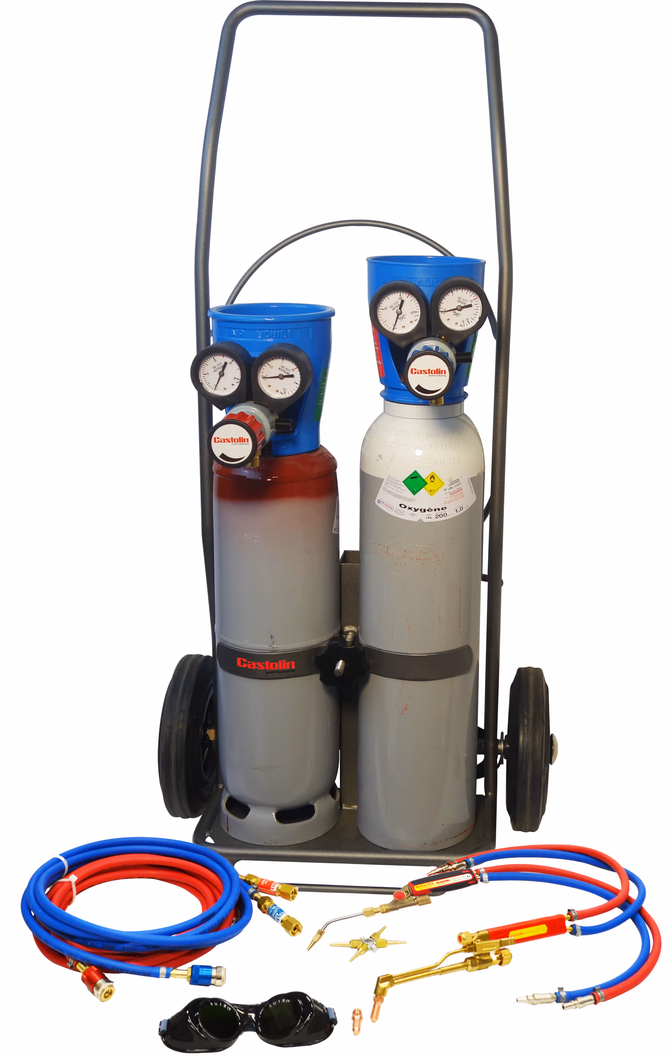 1 bouteille OX 1 m3 avec gaz Air liquide 1 bouteille AD 0,8 m3, avec gaz Air liquide 5 becs et 1 étoile 1 mano-détendeur Xuper Précigaz OX II 1 mano-détendeur Xuper Précigaz AD II 2 x 5 m de tuyaux 6,3 x 11 OX et AD avec colliers de