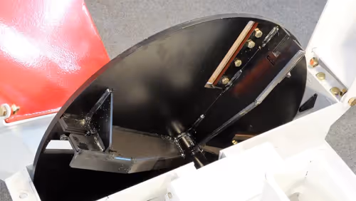 Le dispositif de broyage dispose de 4 lames de coupe de dimensions importantes (160 mm) installées sur disque rotatif en acier qui se situe au bout de la trémie. Ce broyeur de branches peut broyer du bois d'un diamètre maximum de 90 mm avec un rendement horaire de 6/7 mètres cubes.