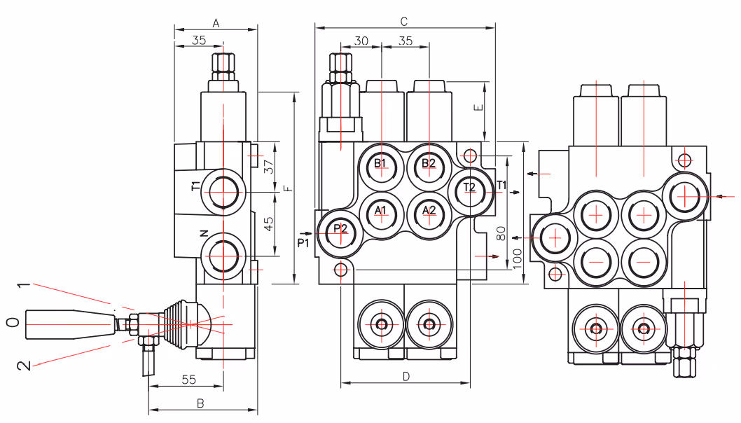 Retour automatique du levier au milieu. Implantation 3/8 gaz (A et B) pour les sorties du côté vérin. Implantation 1/2 gaz (18,6 mm)pour ( P et T) pour l'arrivé et la sortie. Limiteur de pression intégré et réglable pour une pression maximum de 250 bars. Distributeur livré monté par défaut pour une utilisation en centre ouvert. Pour une utilisation en Centre à suivre (CS) utilisez le bouchon FGCS040L AVANTAGES: