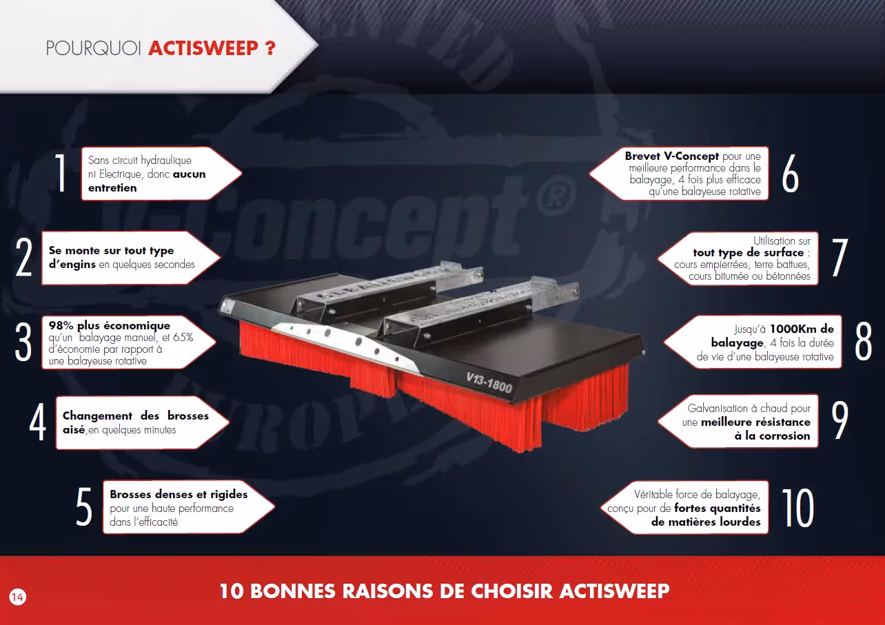 - L'orientation des brosses en forme de "V" permet de rassembler les balayures au centre du balai et de supprimer les andains qui obligeaient à croiser les passages.