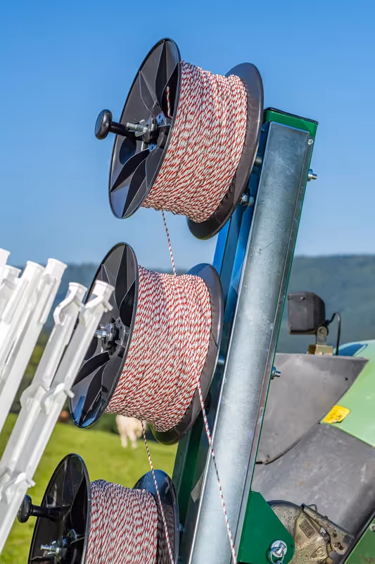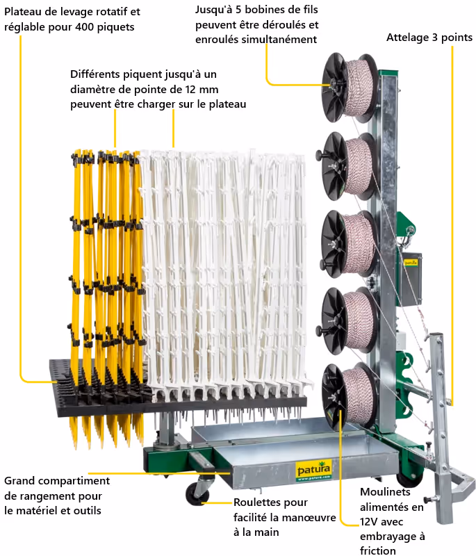 Le Tornado Master 5.0 de PATURA a été spécialement développé pour poser rapidement et efficacement des clôtures mobiles. Une à cinq rangées de fils peuvent être enroulées et déroulées en même temps. Lors du montage des clôtures, les bobines sont tendues et guidées par un système de frein réglable. Lors du démontage, le moteur électrique en association avec le bras de guidage assure un enroulement régulier et sécurisé des fils conducteurs. La plateforme rotative interchangeable peut contenir jusqu’à 400 piquets. Avec le Tornado Master 5.0, il est possible d’atteindre un rendement horaire élevé et améliorer simultanément le confort de travail.