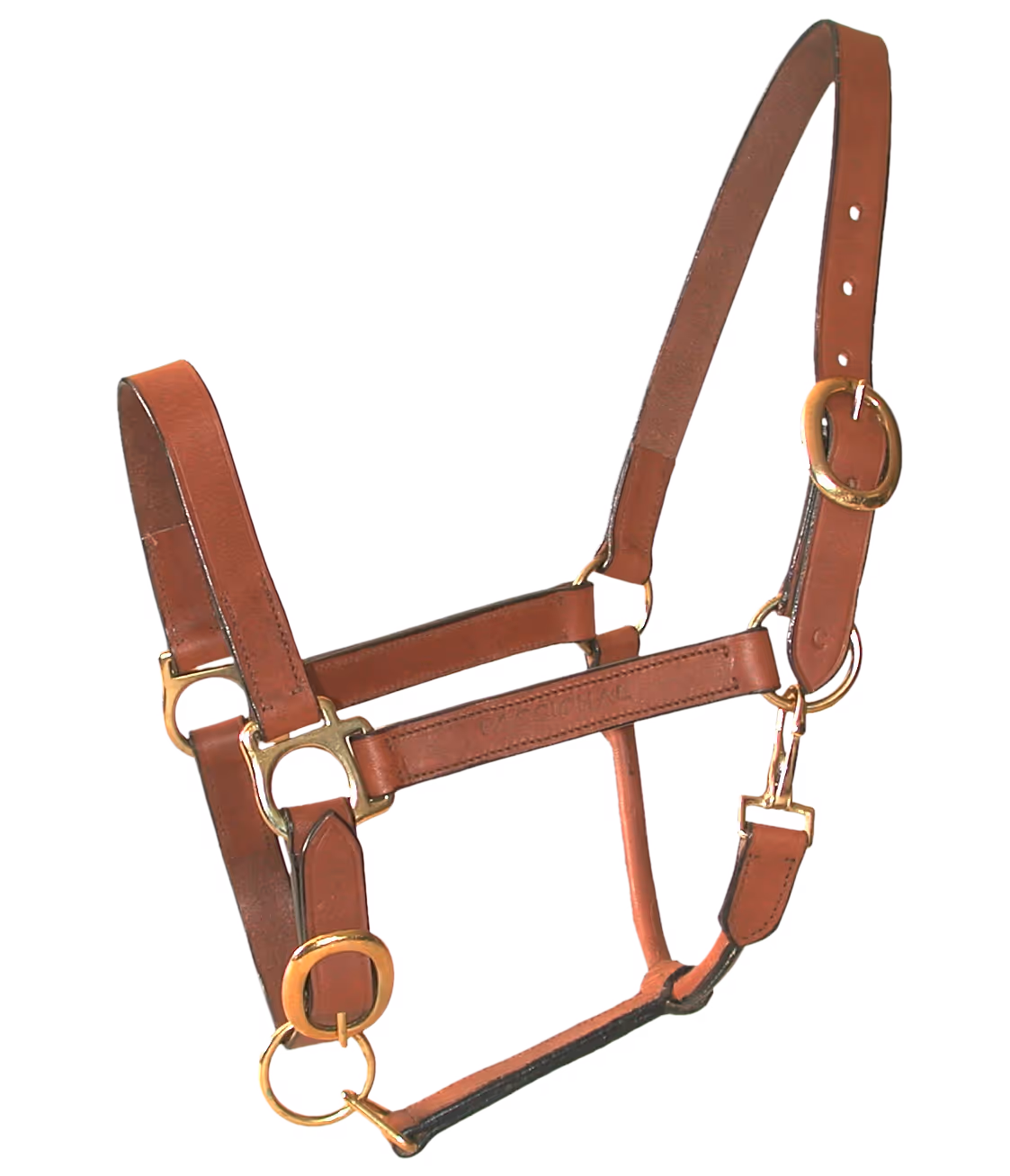 "Cuir tannage végétal, huilé Bouclerie acier laitonné Double réglage muserolle et têtière Ouverture rapide de la sous gorge par mousqueton"