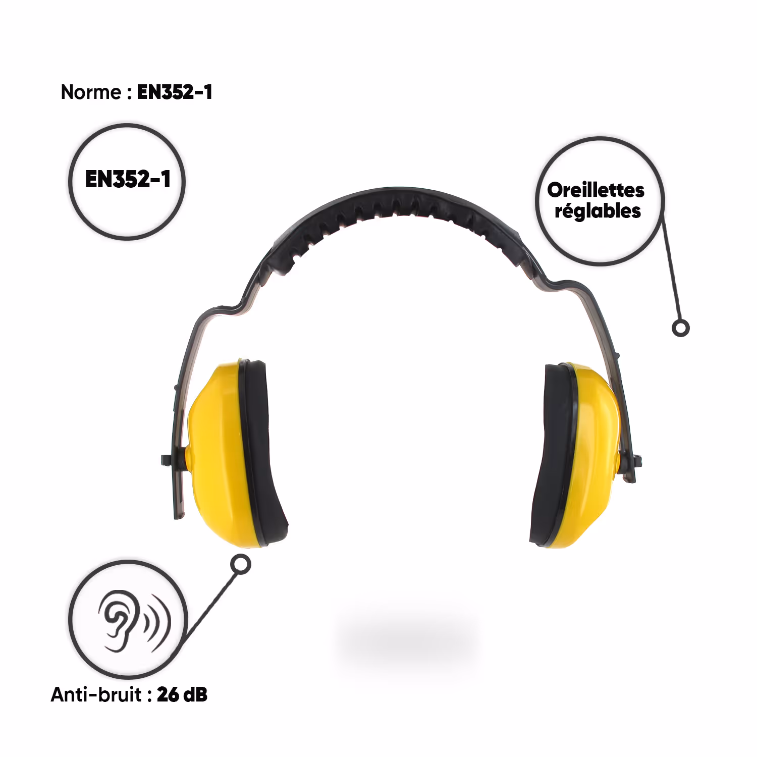 Casque anti-bruit 24 dB avec oreillettes réglables. Norme EN352-1.