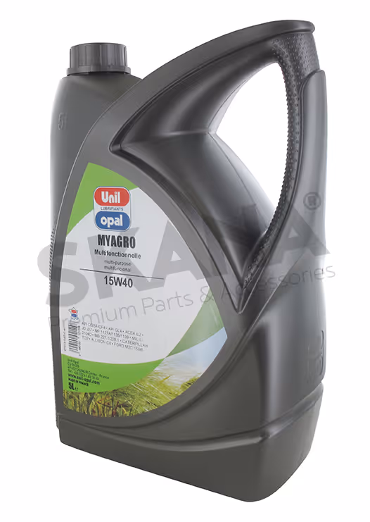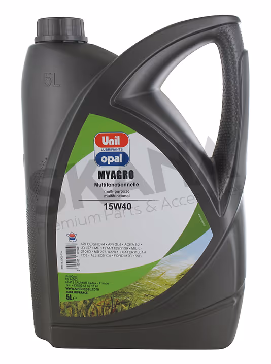 Huile à usage mixte (essence ou Diesel) 15W40 UNIL-OPAL MYAGRO. Bidon de 5 L.MULTIFONCTIONNELLE 15W40. ACEA E2, API CE/SF/CF4, API GL-4. Viscosité: 14,1 mm²/s à 100 °C. - 104 mm²/s à 40°C. Pour tous moteurs (essence/diesel) suralimentés ou non.