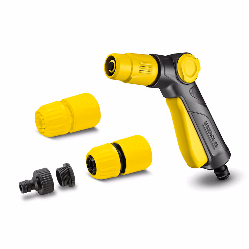 Un seul kit avec tous les éléments dont vous avez besoin pour un arrosage confortable de votre jardin. Le pistolet d'arrosage (réf. 2.645-265.0) facilite votre travail grâce à la poignée avec fonction de verrouillage, en assurant ainsi un débit d'eau constant. En plus, vous pouvez constamment changer entre 2 formes d'arrosage: un jet crayon et un jet conique creux. Le jet peut être utilisé ou bien pour l'arrosage de parterres de fleurs ou de plantes, ou bien pour l'élimination de gros déchets de votre terrasse ou de vos meubles de jardin. En complément du pistolet d'arrosage, le kit contient également un raccord au robinet G3/4" avec réducteur G1/2, et 2 raccords universels (dont un avec Aqua Stop). Le raccord avec Aqua Stop prévient l'arrivée de l'eau à la fin du tuyau d'arrosage, même si, par exemple, le pistolet est retiré au moment où le robinet est toujours ouvert. En plus, lesraccords universels conviennent à tous les diamètres traditionnels de tuyaux d'arrosage. D'ailleurs: les lances d'arrosage et les raccords de Kärcher sont compatibles avec tous les systèmes click disponibles et peuvent être raccordées sans problèmes à votre tuyau d'arrosage.