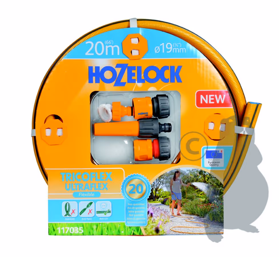 Tuyau d'arrosage Ø19mm x L 20m TRICOFLEX ULTRAFLEX HOZELOCK tricoté 5 couches, flexible et anti-torsion, jaune avec sur-épaisseurs 3D grises. Résiste au gel. Avec batterie de 3 raccords et 1 jet d'arrosage réglable. Garantie 20 ans. ->PLTuyau d'arrosage TRICOFLEX ULTRAFLEX tricoté 5 couches, flexible et anti-torsion, jaune avec sur-épaisseurs 3D grises. Résiste au gel. Livré avec batterie de 3 raccords et 1 jet d'arrosage réglable.