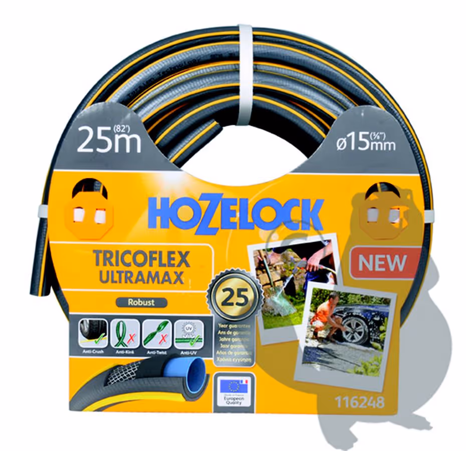 Tuyau d'arrosage Ø15mm x L 25m TRICOFLEX ULTRAMAX HOZELOCK tricoté 5 couches, robuste et anti-torsion, gris avec sur-épaisseurs 3D jaunes. Garantie 25 ans. ->PLTuyau d'arrosage TRICOFLEX ULTRAMAX tricoté 5 couches, robuste et anti-torsion, gris avec sur-épaisseurs 3D jaunes. Résiste au gel.