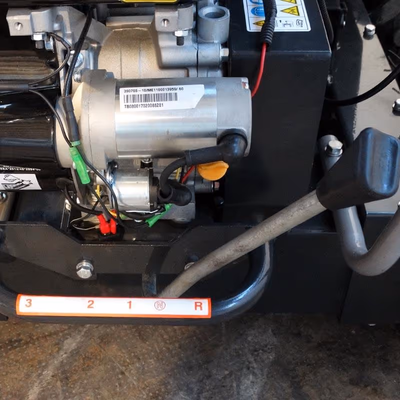 La boîte de vitesses, robuste et fiable, est dotée d'une protection en acier de 5 mm d'épaisseur qui la protège contre les pierres ou autres objets dans le sol. La transmission mécanique comporte trois vitesses plus une marche arrière. Le cadre est doté d'une solide structure en acier qui limite les vibrations et le bruit. Le centre de gravité bas assure également une stabilité optimale pendant le travail. En outre, la position du moteur et de la transmission facilite le nettoyage et l'entretien.