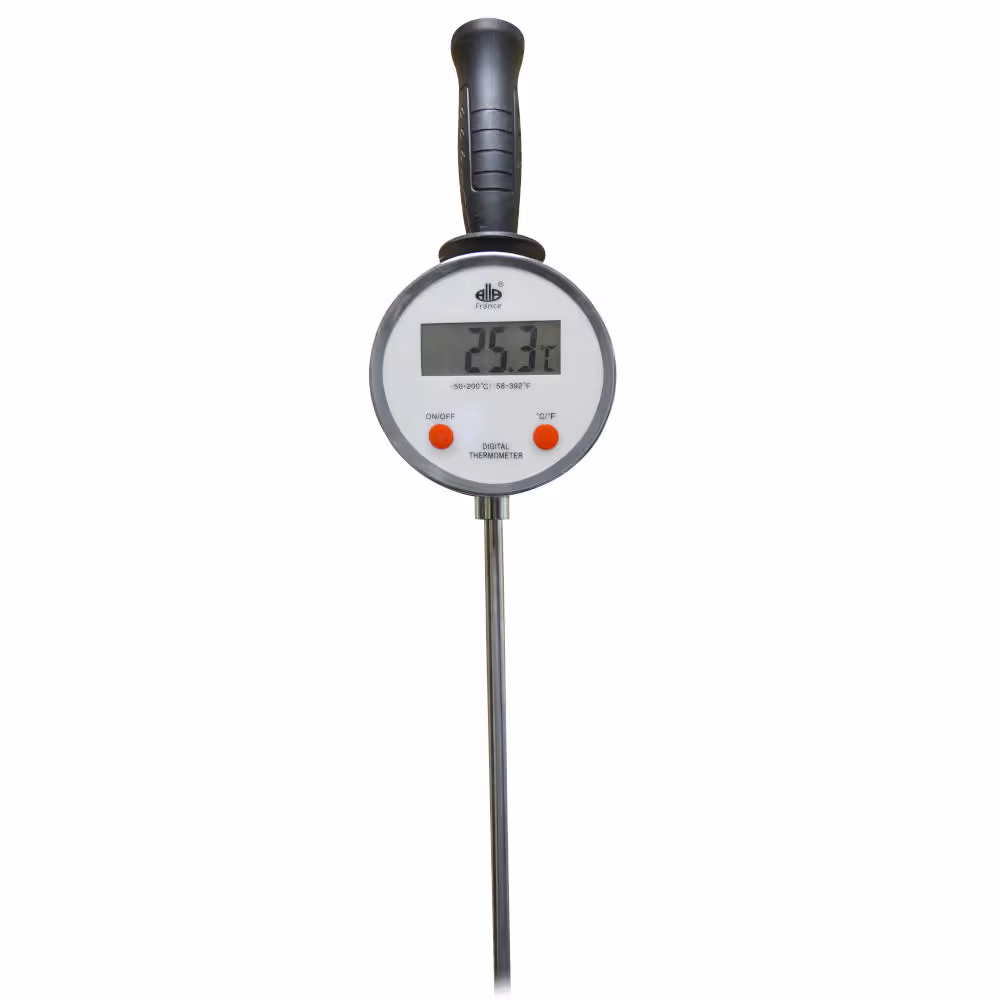 Thermomètre digital équipé d'une longue sonde fixe mesurant 1.45 m. Thermomètre idéal pour effectuer des relevés dans des cuves, foin, fromage, température du sol et contrôler la température dans des lieux difficiles d'accès. Sonde en inox 340 idéale pour le contact alimentaire. Ne permet pas de mesurer l'hygrométrie. Caractéristiques: Sonde d'une longueur de 1.45 m et d'un Ø 10 mm -50°C à +200°C / -58°F à +392°F Résolution : 0,1° Précision : ±1°C / ±2°F Cadran : ø 100 mm Affichage : Gros digit Sonde en inox 340 Protection de la pointe Fonctionne avec 1 pile LR03AAA (Si l'affichage devient faible, remplacer la pile) Conseils: Ne pas forcer la sonde Nettoyer après chaque mesure