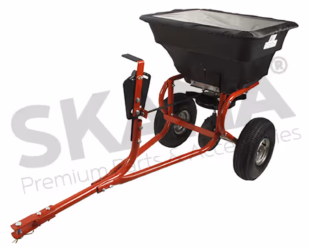 Épandeur rotatif à tracter d'une capacité maximale de 34 kg avec débit réglable par levier, pneus 10" avec bache de protection du bac.Epandeur rotatif trainé.