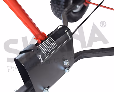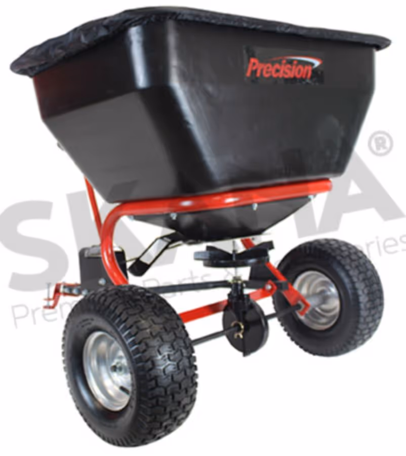 Épandeur rotatif à tracter professionnel d'une capacité maximale de 90 kg avec débit réglable par levier, pour une largeur d'épandage jusqu'à 4m, grandes roues pneumatiques de 15" avec chambre à air.Epandeur rotatif trainé.