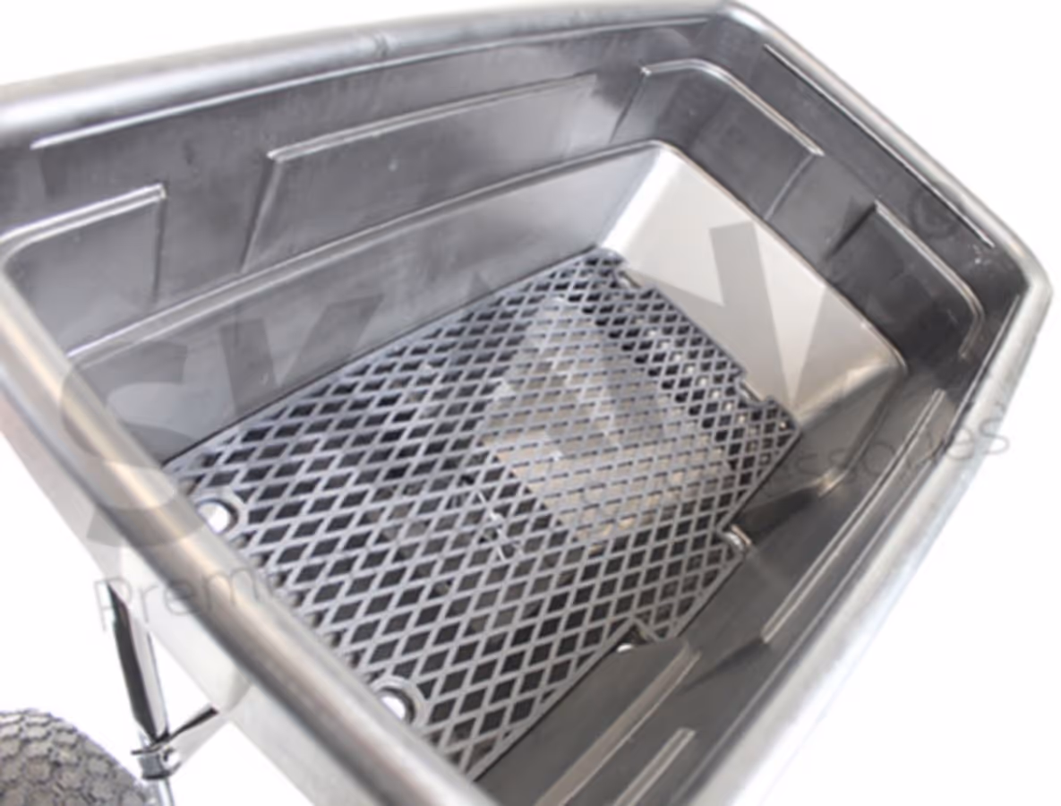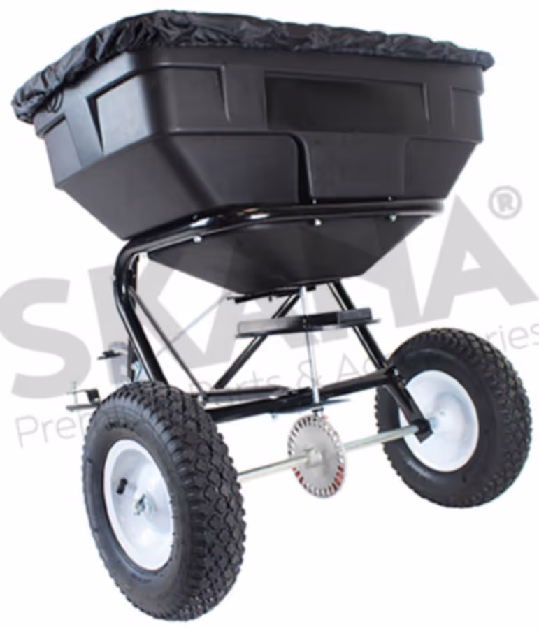 Épandeur rotatif à tracter d'une capacité maximale 56 kg avec débit réglable, pour une largeur d'épandage de 2,5 à 3,5 m, pneus 12 1/2" avec Chambre à air SHAK.Epandeur rotatif trainé.