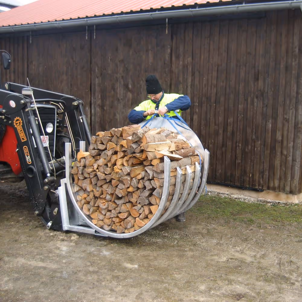 - Le tas de bois cerclé peut être transporté avec un chargeur frontal