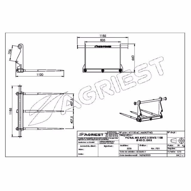 Fourche à balle : Découvrez Pic'bal mx avec 3 dents 1100x40 percee gris disponible à l'achat