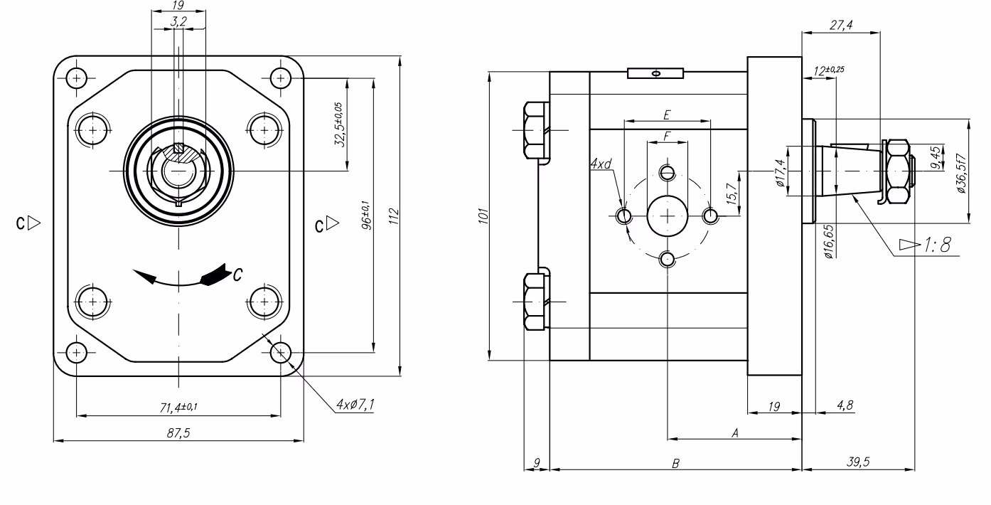 Pompe hydraulique fixation 4 trous arbre conique 1/8 - 25 cm3, Horaire