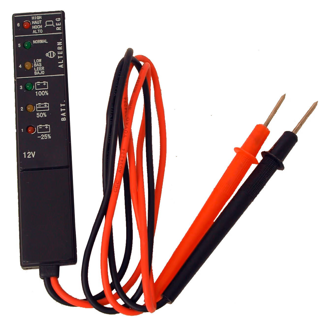"Mesure le niveau de charge de la batterie avec 3 témoins LED. Evalue l’état de l’alternateur. Evalue l’état du régulateur."