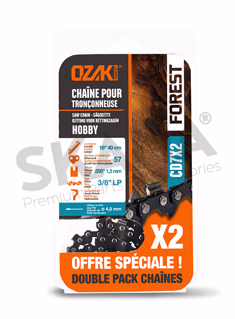 Lot de deux chaînes de tronçonneuse OZAKI sous coque semi carrée: .3/8"LP .050" (1,3mm) 57 entraîneurs ( E57 ).