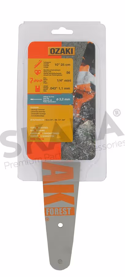 Guide OZAKI modèle ZKU25MINI + deux chaînes 1/4" .043 (1.1mm) 56 entraîneurs. Montage universel pour élagueurs guide 10" (25cm). Livré sous coque.