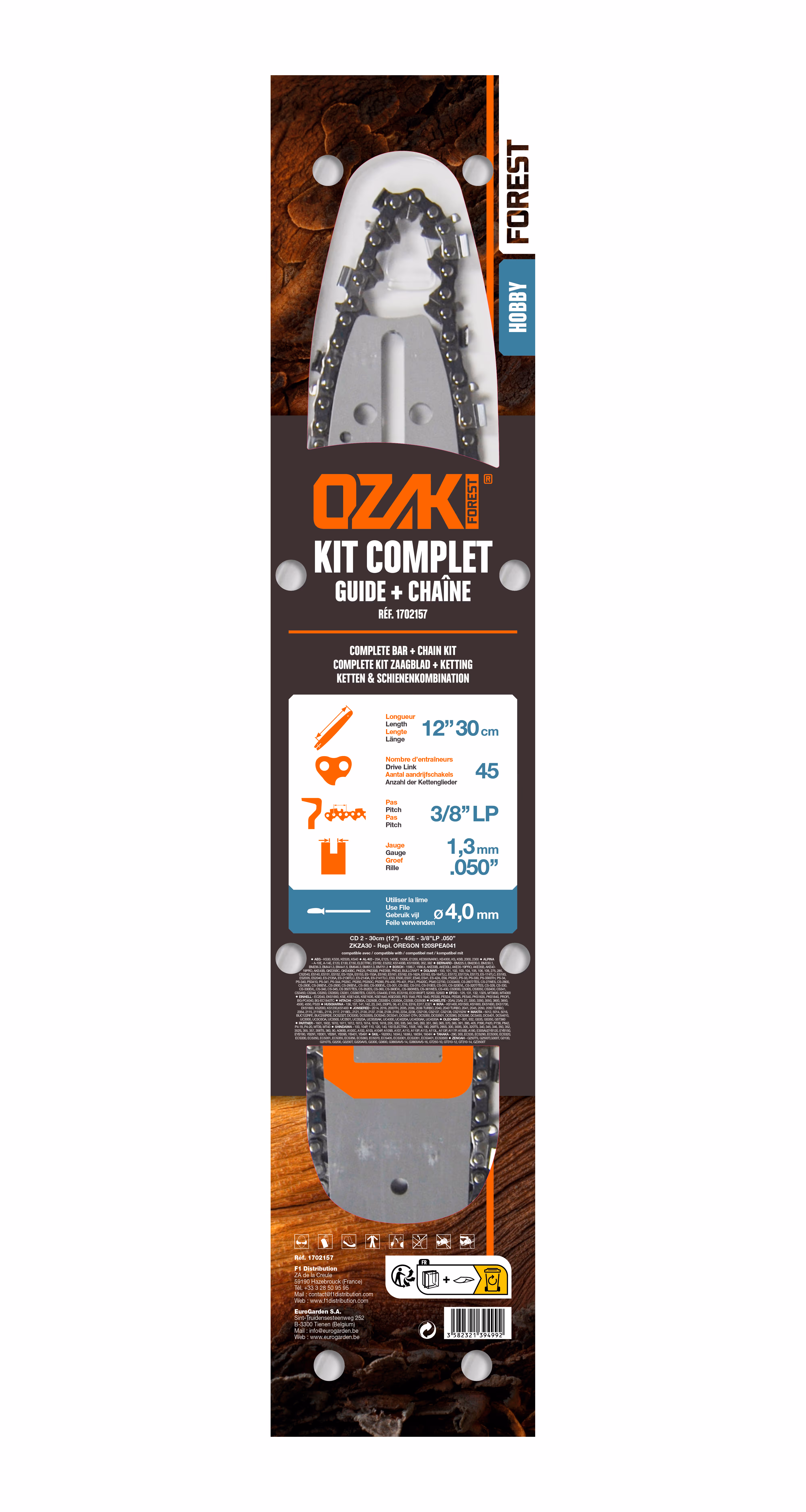 Guide OZAKI ZKZA30 + Chaîne 3/8 low pro .050 (1.3mm) 45 entraîneurs ( E45 ). Remplace Guide Oregon 120SPEA041. Livré sous coque.