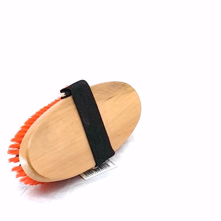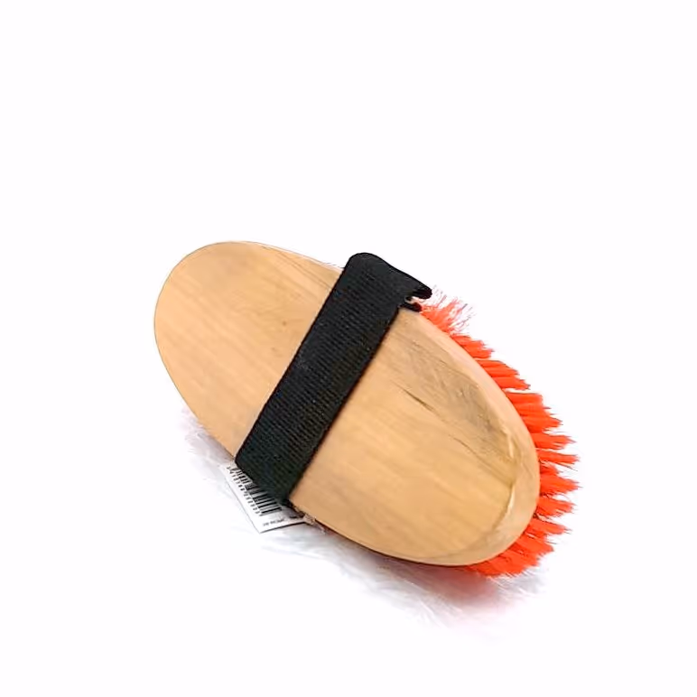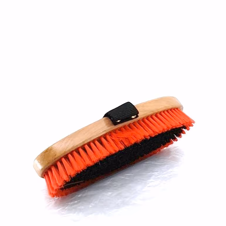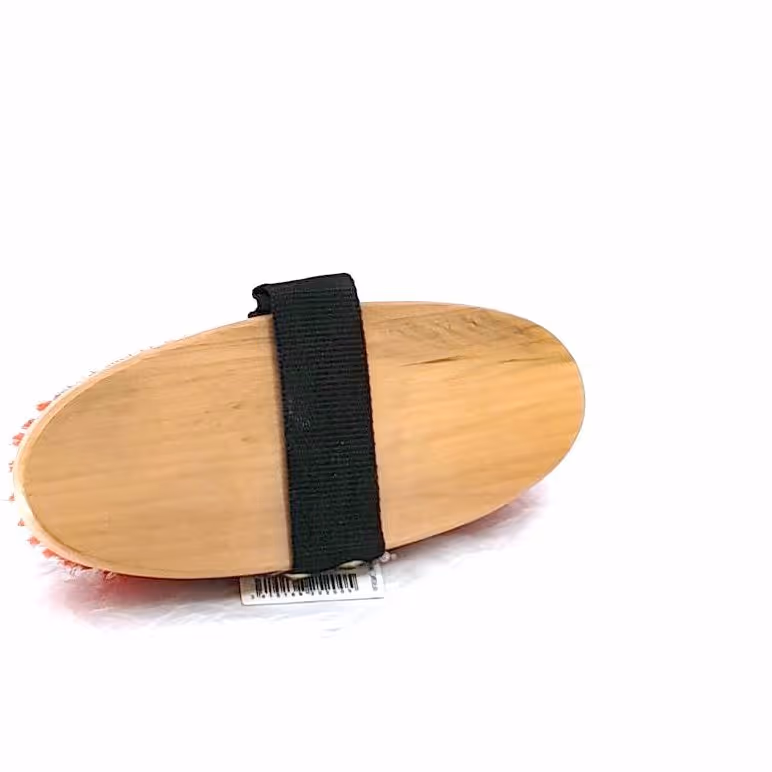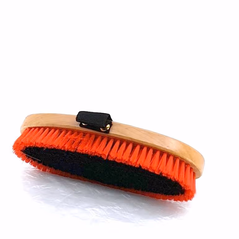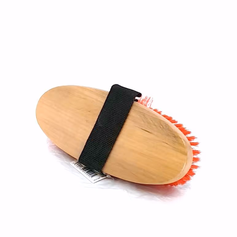 "Dernière étape du pansage pour lustrer la robe Manche bois verni Sangle Poils synthétiques doux"