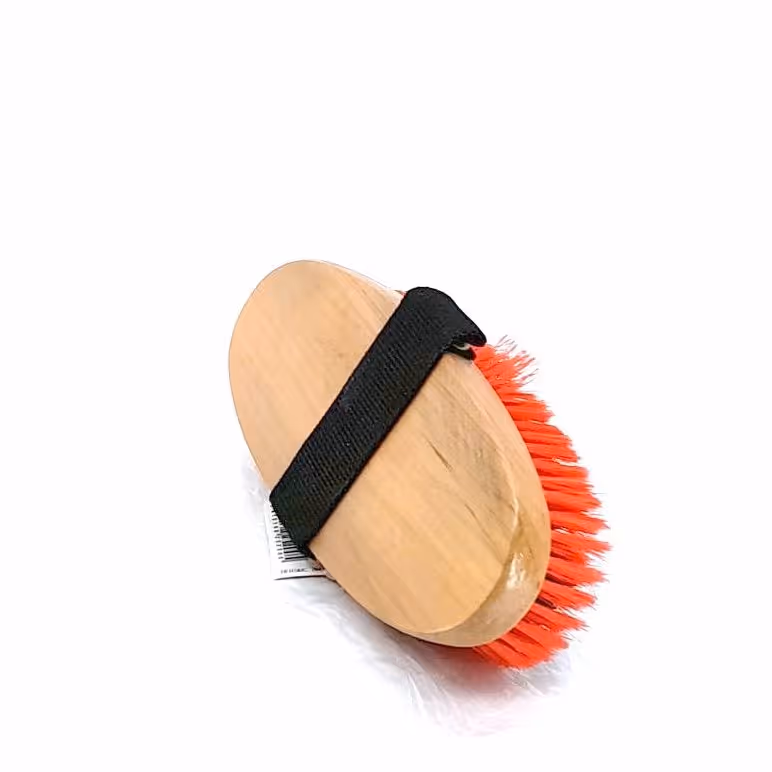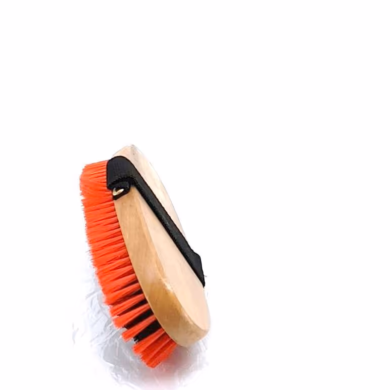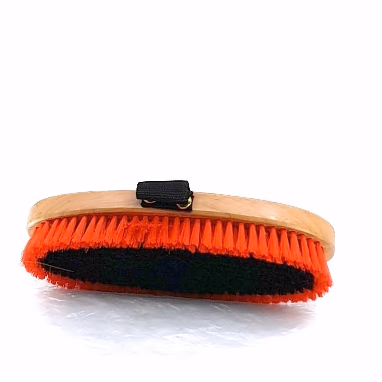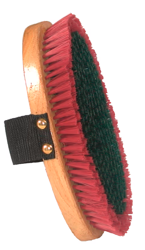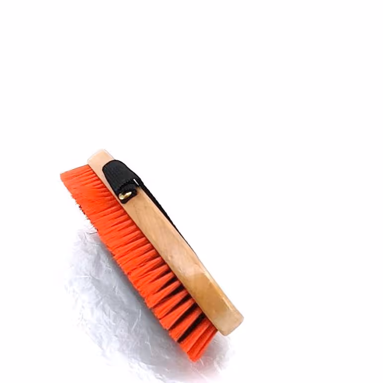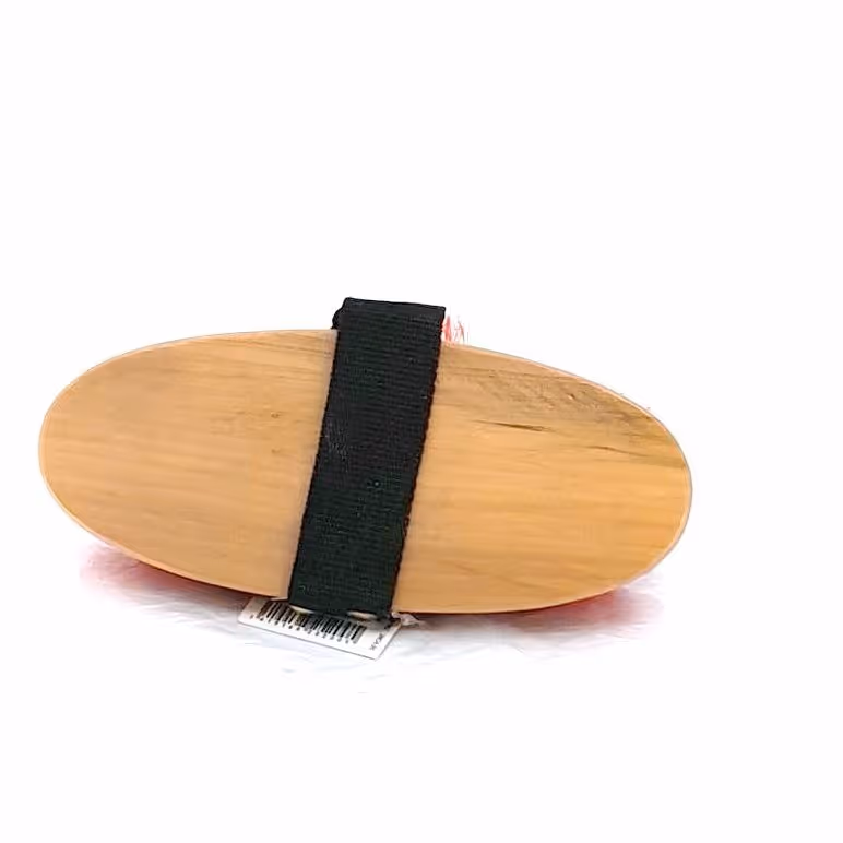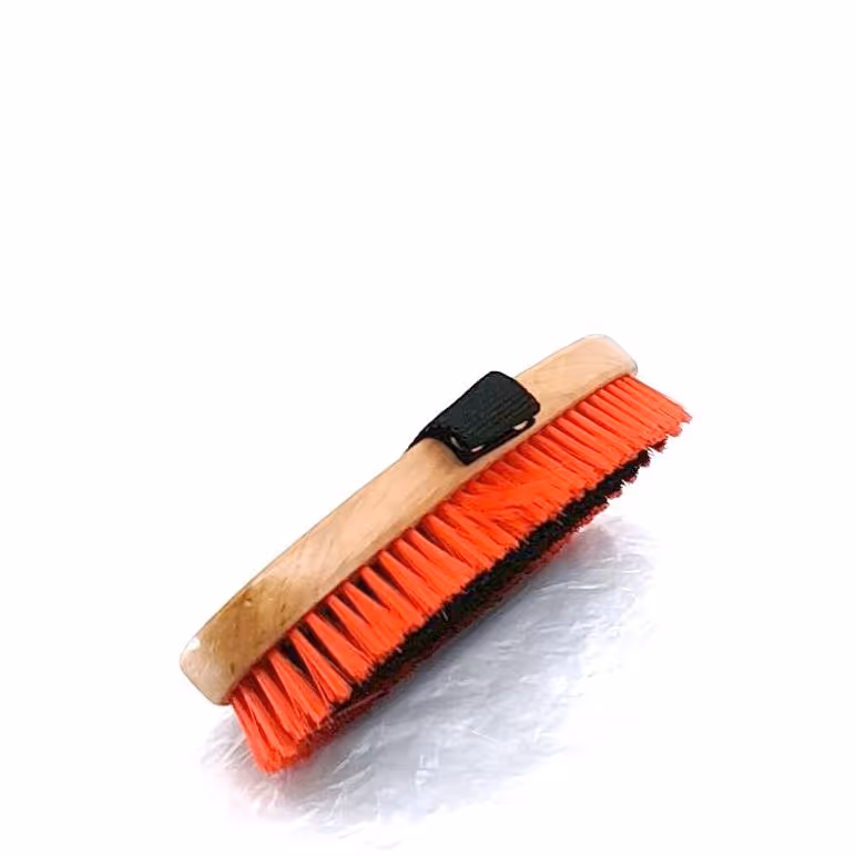 "Dernière étape du pansage pour lustrer la robe Manche bois verni Sangle Poils synthétiques doux"