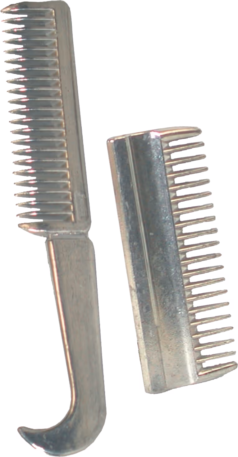 "Peignes en aluminium Peigne avec manche pour démêler la queue Peigne sans manche pour raccourcir et natter la crinière Conseil : utiliser la lotion lustrante et démêlante pour faciliter le toilettage"